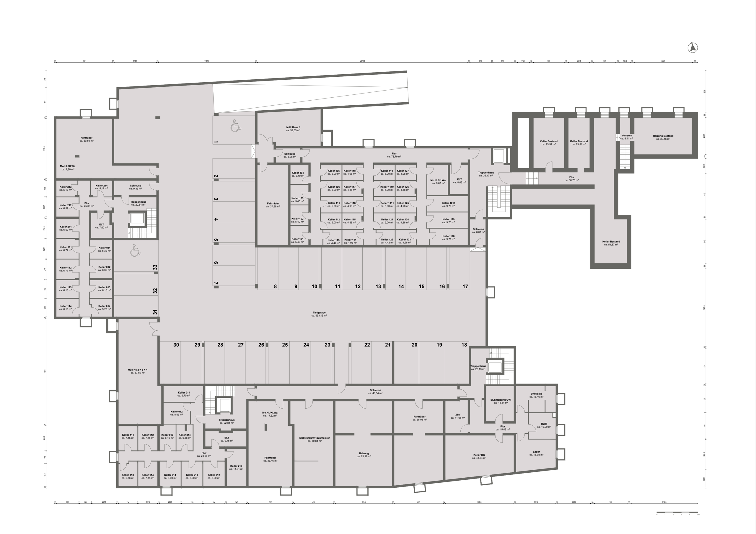 Über dieselbe Rampe sind auch die Fahrradkeller erreichbar, die sich angrenzend an die Tiefgarage unter Haus 2 und 3 befinden.